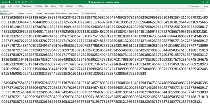 Let's return to the giant Excel spreadsheet the CTO sent over. Instead of shutting down, I simply added a period after the first digit of every number strand.