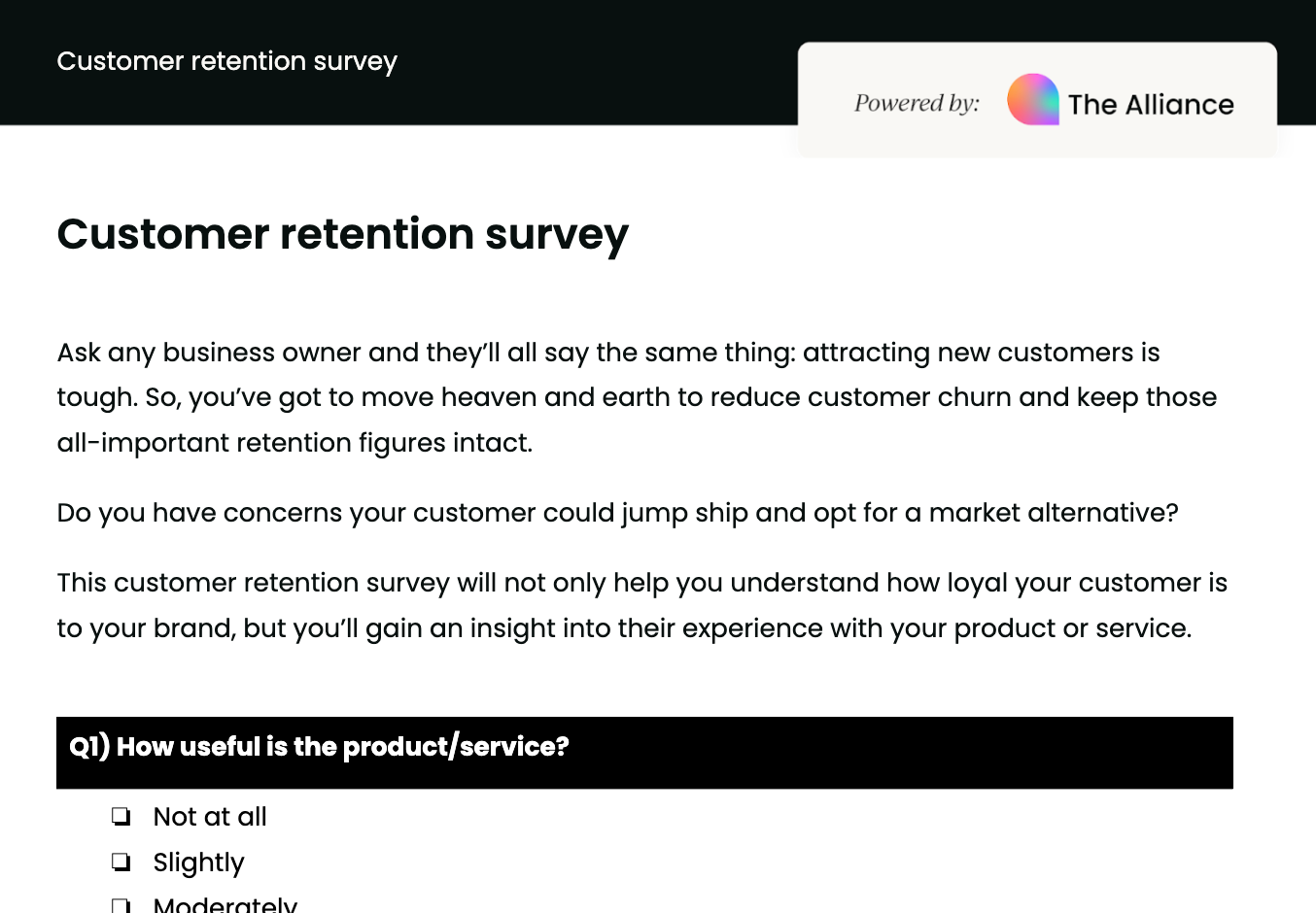 This survey template is crafted to help you pinpoint exactly what your customers value, where improvements are needed, and how to address concerns before they lead to churn.