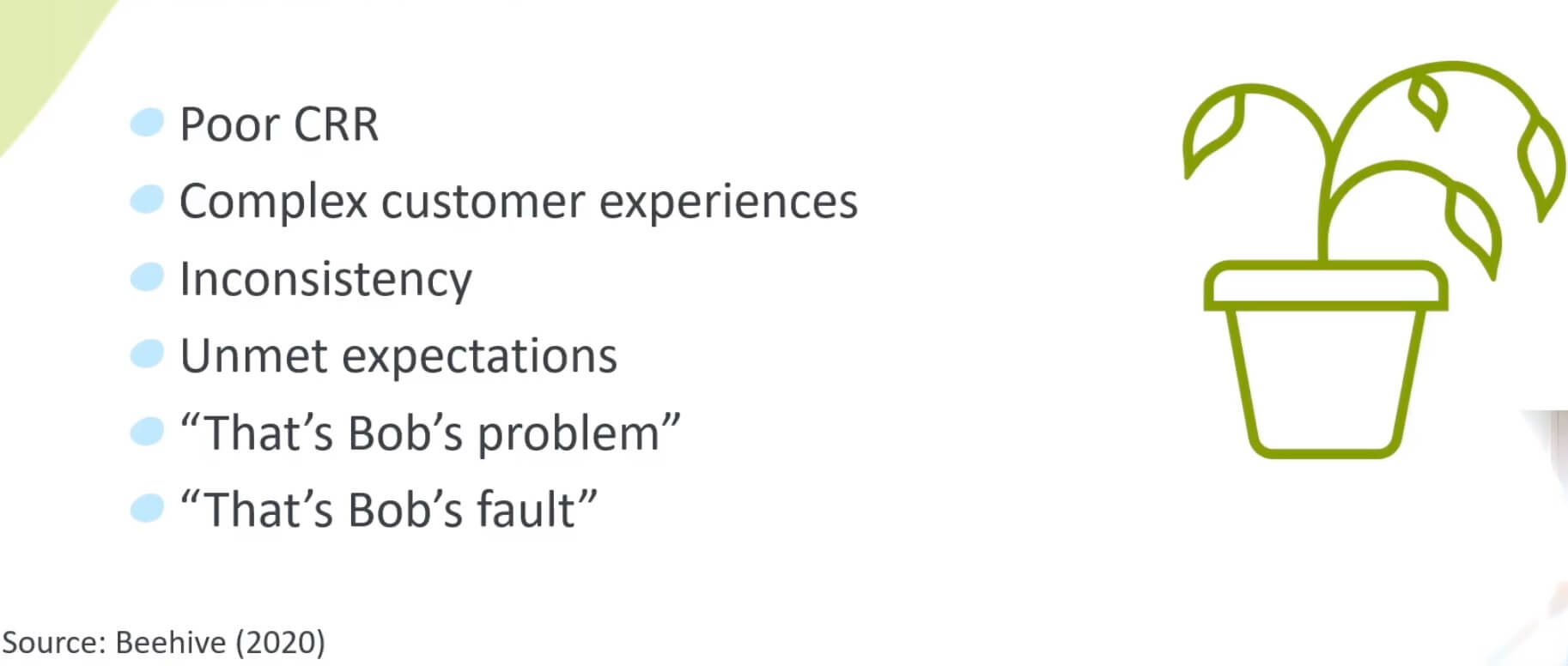 It's really around customer issues that get passed around the houses, no one taking ownership, it's a blame culture, "That wasn't my issue. It was a negative customer experience, it wasn't my fault". It's always someone else's fault.