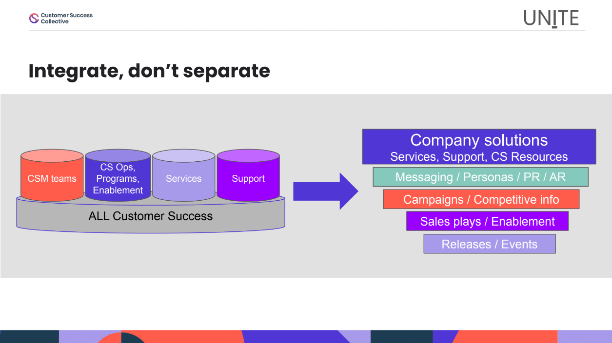 It's important to align customer success with other departments such as sales, marketing, and enablement. Too often, CS operates in silos, using distinct systems and processes that, while effective on their own, could significantly benefit from integration with wider organizational strategies.